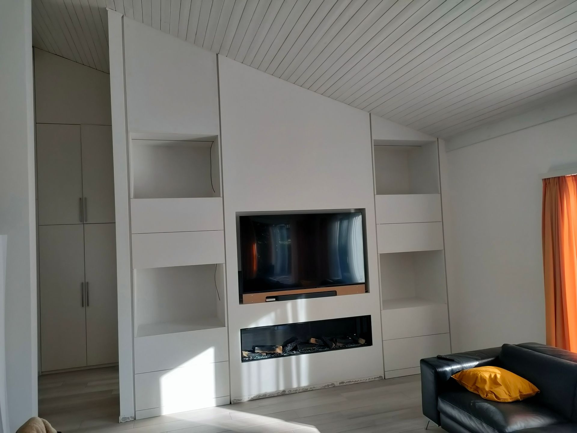 Parte centrale in cartongesso con nicchie per TV e generatore d'aria calda con animazioni realistiche e luci LED. Parti inferiori con 2 cassettoni a estrazione totale, con blumotion e apertura a pressione. Pensili con doppie ante, impugnature nascoste, sistema di apertura BLUM Aventos HF top. Nicchie a vista con illuminazione LED a intensità regolabile. MDF grezzo pitturato come le pareti.